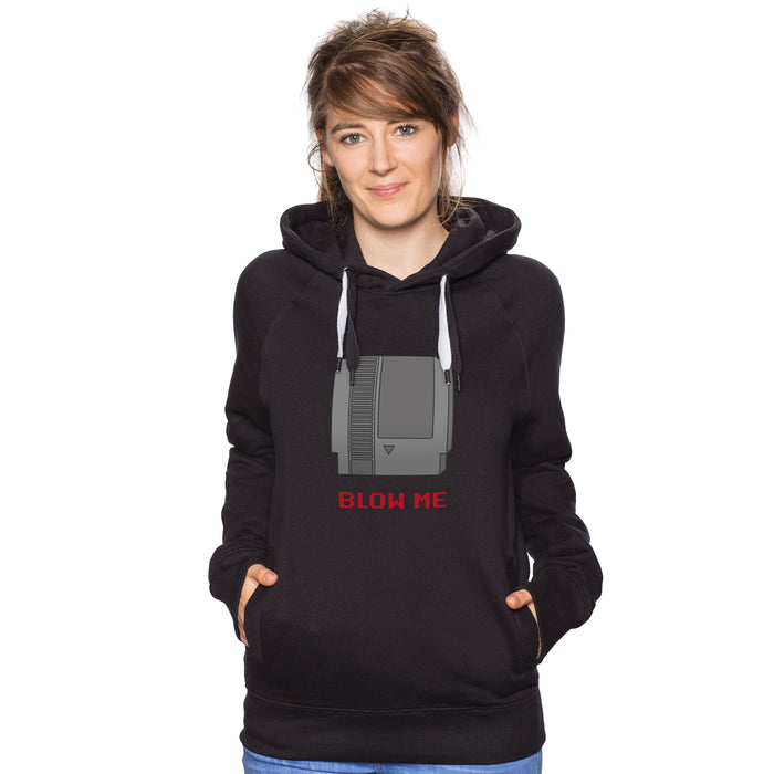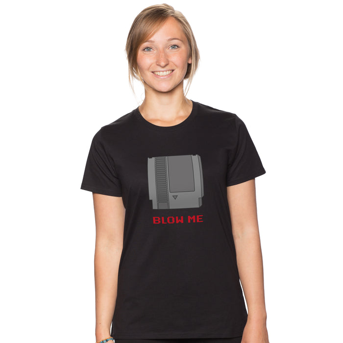 In der Mitte des Shirts prangt eine Videospielkassette aus längst vergangenen Zeiten samt Slogan "[i]Blow me[/i]". Dies kann einerseits als Anspielung auf die urbane Legende, dass das Pusten in die Kassette bei Startschwierigkeiten helfen kann, gesehen werden - oder als Aufforderung, die Person im Shirt in Ruhe zu lassen. Denn "Blow me" ist das US-amerikanische Pendant zum deutschen "[i]Leck mich[/i]!". Nicht nett, dafür aber effizient! ;)