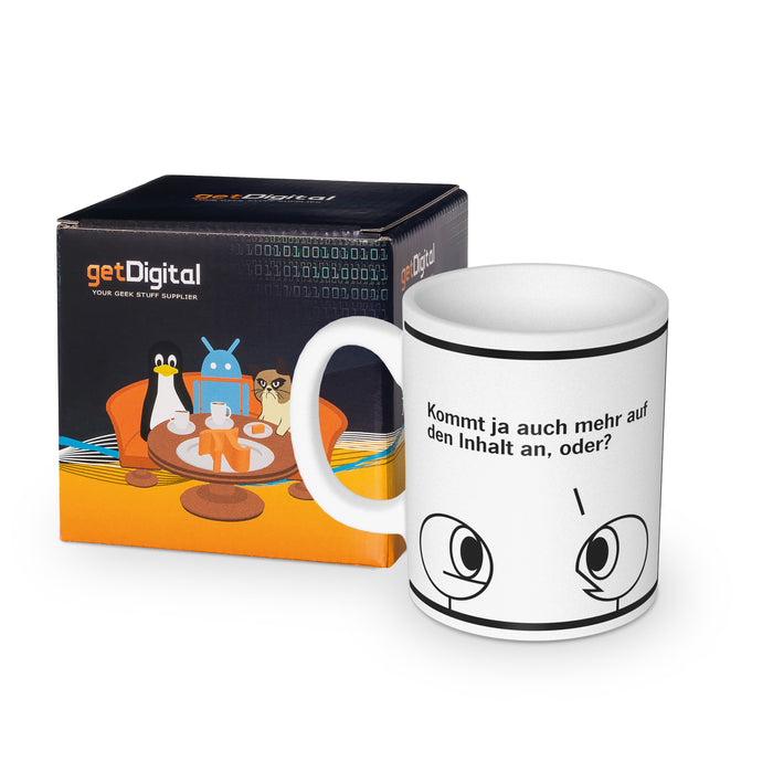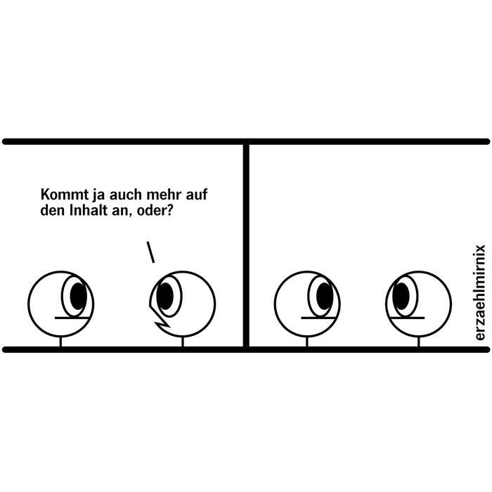 Auf genau diesen Umstand weist der Erzaehlmirnix Webcomic-Becher hin. Der Aussage der einen Figur kann man auch nichts mehr hinzufügen. Also einfach Kaffee einfüllen und genießen. Wer hätte gedacht, dass das so einfach sein kann?