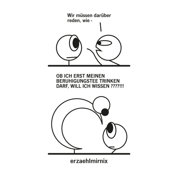 Die Sache mit Beruhigungstee ist ja, dass dieser auch erstmal in Ruhe getrunken werden muss. Und dann muss er erst noch in Ruhe vom Körper aufgenommen werden. Du merkst schon: Auf „in Ruhe“ kommt es an! Aber wie der erzaehlmirnix-Becher „Beruhigungstee“ zeigt, respektiert nicht jeder Mensch diese ungeschriebene Regel des Miteinanders. Dabei ist es doch ganz einfach: Mund halten, bis der Beruhigungstee getrunken ist. Dann sicherheitshalber noch länger den Mund halten. Und dann noch bis zum Feierabend warten. ;)