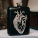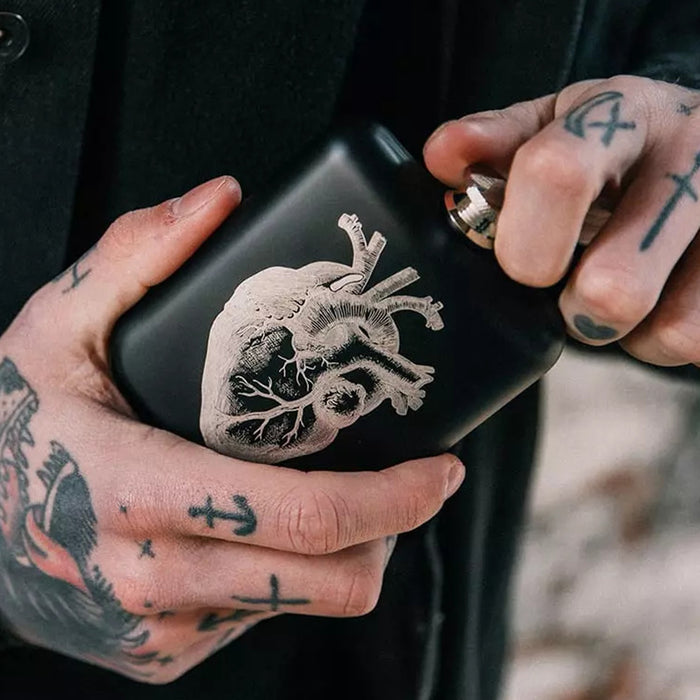 Der schwarze Stahl-Flachmann eignet sich perfekt für den Transport eines guten Tropfens und kann mit einem Drehverschluss verschlossen werden. Die Front ist mit einer Lasergravur verziert, die ein hochdetailliertes anatomisches Herz zeigt.