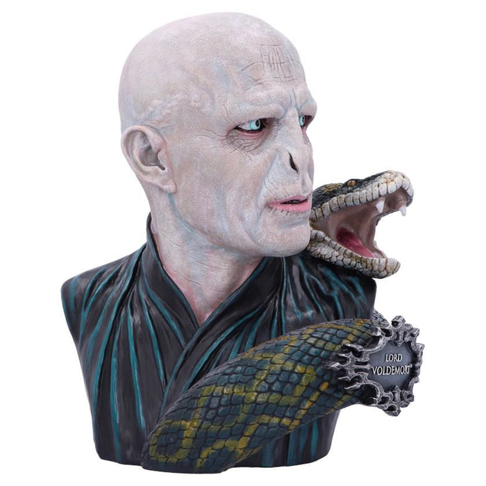 Die Harry Potter Voldemort & Nagini Büste zeigt ihn in all seiner Schrecklichkeit vom bleichen, kahlen Kopf über die schlangenähnliche Nase bis hin zu seinen blutunterlaufenen, eisblauen Augen, aus denen bereits das „Avada Kedavra“ zu sprühen scheint. An seiner Seite ist natürlich auch hier seine Schlange Nagini. Beide bestehen aus Kunstharz und sind detailgetreu und lebensecht von Hand bemalt.