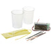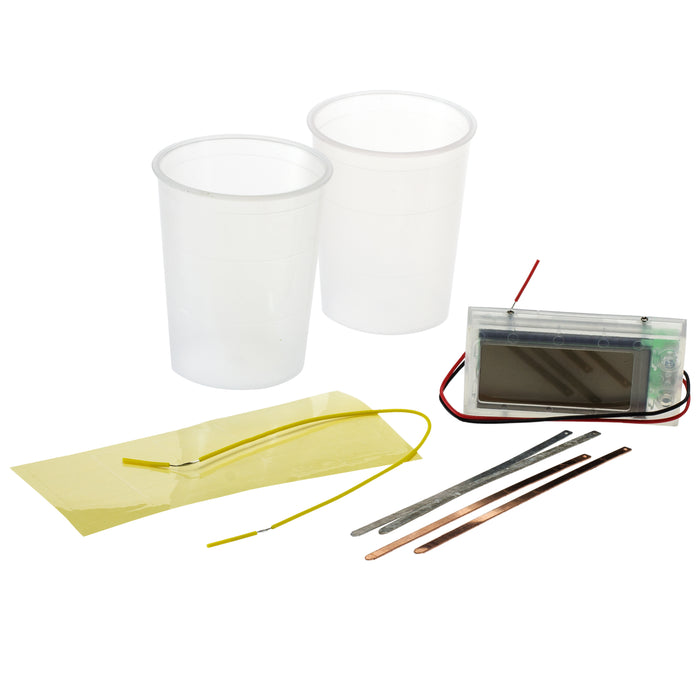 Neben der Digitaluhr selbst, Kabeln, Kupfer- und Zinkstreifen enthält das Set auch zwei Becher, mit deren Hilfe man z.B. aus Salzwasser oder Zitronensaft eine Batterie herstellen kann.