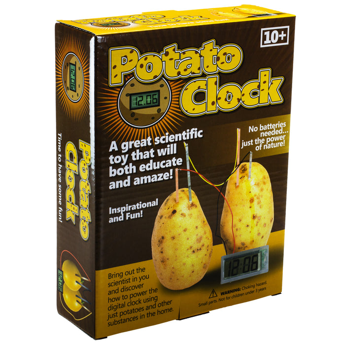 Vielleicht erinnerst Du Dich noch an Deinen ersten Physik-Baukasten, mit dem man aus verschiedenen Früchten Strom für eine kleine Glühbirne gewinnen konnte? Genauso funktioniert die Kartoffel Uhr, nur dass man statt einer schwachen Lampe eine funktionierende Digitaluhr betreiben kann. Die Kartoffel-Batterie