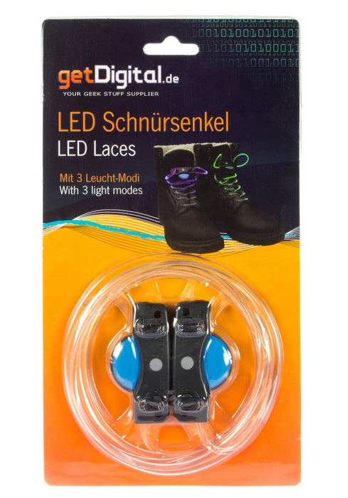 Die LED Schnürsenkel passen dank 80cm Länge in fast alle Schuhe und können bei Bedarf sogar einfach mit einer Schere gekürzt werden. Keine Angst: Das Leuchten dieser Schnürsenkel beruht leider nicht auf einer geheimen radioaktiven Substanz in den Schnürsenkeln, sondern entsteht durch LEDs, die in das Hauptstück eingebaut und mit einer kleinen Knopfzelle versorgt werden. Nachdem du die Schnürsenkel eingefädelt hast, musst du die Enden nur noch mit dem Hauptstück verbinden und kannst dann mit einem kleinen Knopf zwischen den Modi dauerhaftes Leuchten sowie schnelles und langsames Blinken wechseln oder das Leuchten komplett ausschalten. Im Blinkmodus hält die Batterie ca. 70 Stunden durch (natürlich kannst Du sie danach auswechseln). Noch ein Wort zur Leuchtstärke: Der Effekt ist vor allem im Dunkeln beeindruckend, am Tage kann es dagegen je nach Helligkeit auch fast nicht sichtbar sein.