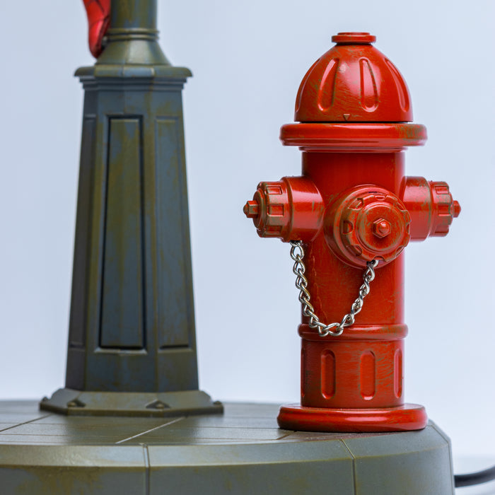 Aber während wir auf „Old Man Spidey“ warten, können wir immerhin mit der dekorativen „Marvel Spider-Man“-Tischleuchte dem besten Superhelden aller Zeiten in unserer Wohnung ein Denkmal setzen: In diesem detaillierten Diorama hängt „Die Menschliche Spinne“ lässig von einer Laterne, in die eine kleine LED-Lampe eingebaut ist, die bequem über das enthaltene USB-Kabel mit Strom versorgt wird. Es handelt sich dabei um einen Dekorationsartikel mit Leuchtfunktion, der nicht als Schreibtischlampe verwendbar ist.