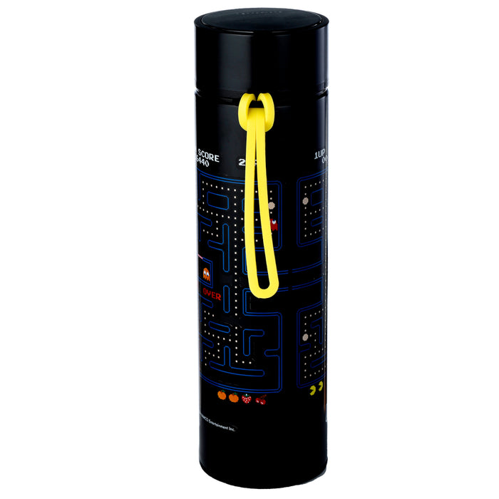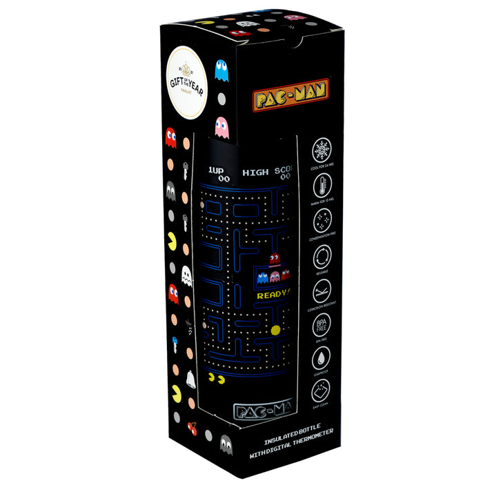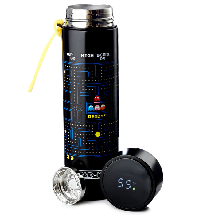 • Das Spielfeld von Pac-Man auf einer praktischen Thermoflasche mit integriertem digitalen Thermometer