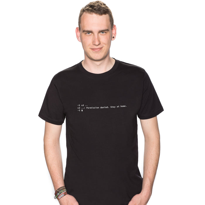 Selbst Linux ist davon genervt und möchte, wie Du auf dem “Permission Denied. Stay at home.”-T-Shirt sehen kannst, dass Du zuhause bleibst. Für alle Uneingeweihten: Auf dem Shirt ist eine Konsole des Betriebssystems Linux zu sehen, in der jemand mit [i]cd[/i] aus dem Heimverzeichnis herauswechseln möchte. Dies wird vom System jedoch abgelehnt und zudem mit “Stay at home“ (Engl. für “Bleib zuhause”) quittiert. Wenn sogar Dein Computer will, dass Du zuhause bleibst, solltest Du Dich lieber daran halten! :)