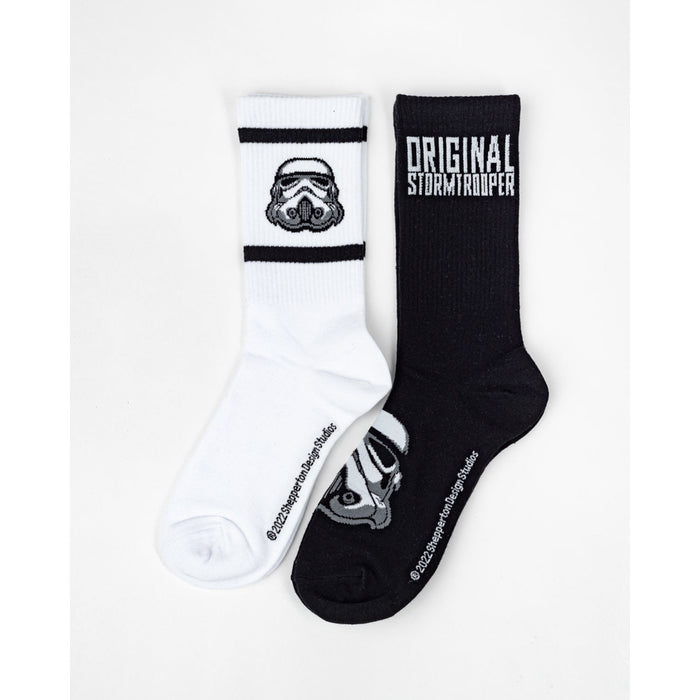 Für ihre täglichen Sporteinheiten tragen sie ausschließlich die vom Imperium gestellten Stormtrooper Sportsocken „Sport Trooper“. Wir konnten einige davon ergattern, sodass du hier gleich ein Set aus einem Paar schwarzer und einem Paar weißer Socken bekommst. Darauf zu sehen sind die ikonischen Helme der Sturmtruppler und auf den schwarzen Socken der Schriftzug „Original Stormtrooper“. Keine Sorge, das bedeutet nicht, dass die Socken schon getragen wurden. ;)
