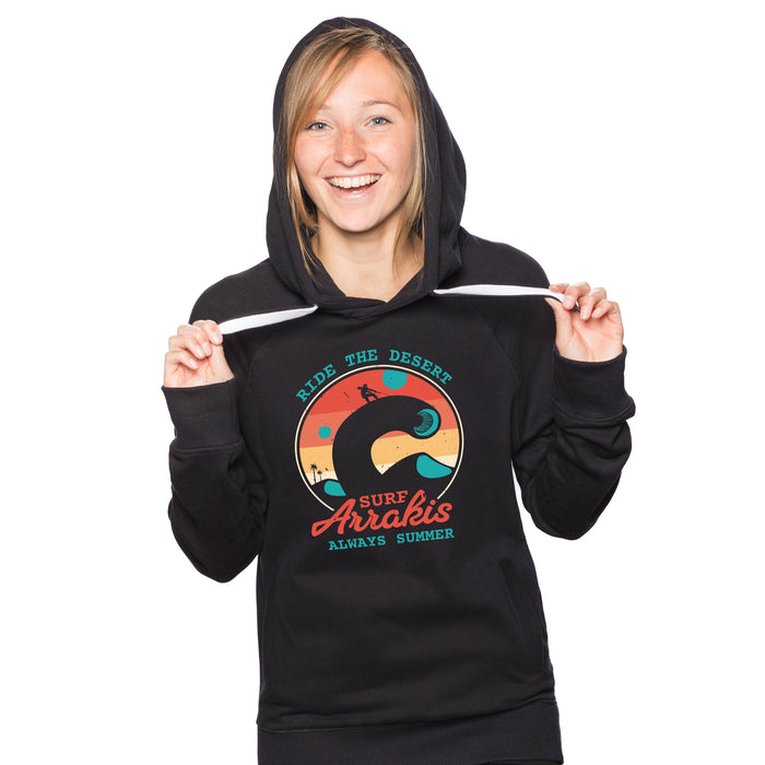 Das Design des T-Shirts greift Elemente typischer Surfer-T-Shirts auf, die normalerweise Wellen und Palmen zeigen, und verwebt sie mit der fiktiven Welt von "Dune". Der Satz "Ride the Desert" anstelle des üblichen "Ride the Waves" sowie der Slogan "Surf Arrakis, Always Summer" spielen auf die ewige Hitze und die endlosen Sandwüsten von Arrakis an. Der Gesamteindruck ist eine humorvolle und stilvolle Hommage an die Geschichte und Thematik von "Dune", wobei die Bildsprache der Surferkultur geschickt in ein Science-Fiction-Setting adaptiert wird.