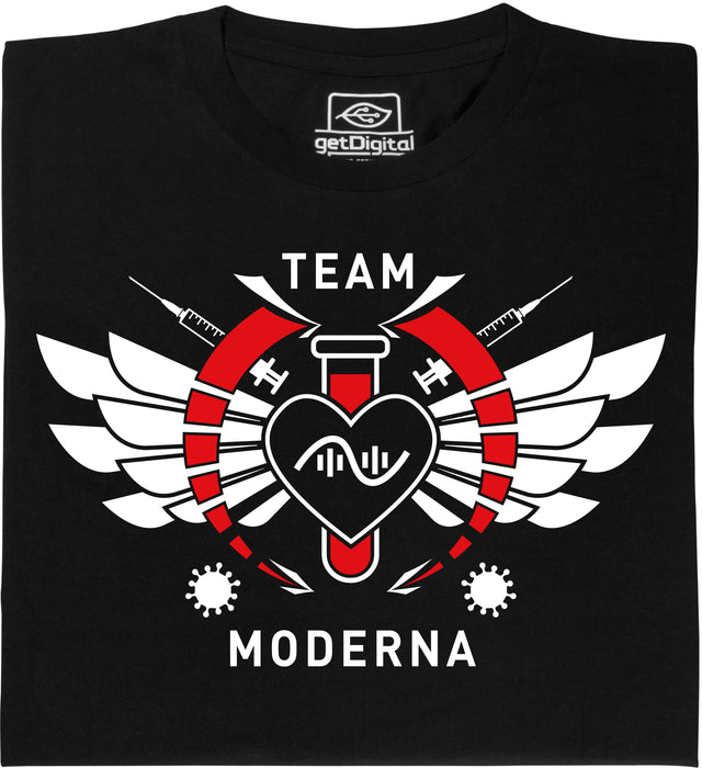 Moderna ist ähnlich wie der BioNTech-Impfstoff mit der neuartigen mRNA-Technologie entwickelt worden. Außerdem kann er bei nur -20°C einfach gelagert werden. Auf dem Team Moderna-T-Shirt findest du ein farblich passendes Logo, das mit der roten Farbe und gestrichelten Linie an das Firmenlogo von Moderna angelehnt ist. Im [i]Herzen[/i] des Logos befindet sich ein mRNA-Strang als Anspielung auf die Wirkungsweise des Vakzins. Außerdem zwei Spritzen, die auf die zwei Impfdosen hindeuten. Und die beiden kleinen, dekorativen Viren können dir nun nichts mehr anhaben! ;)