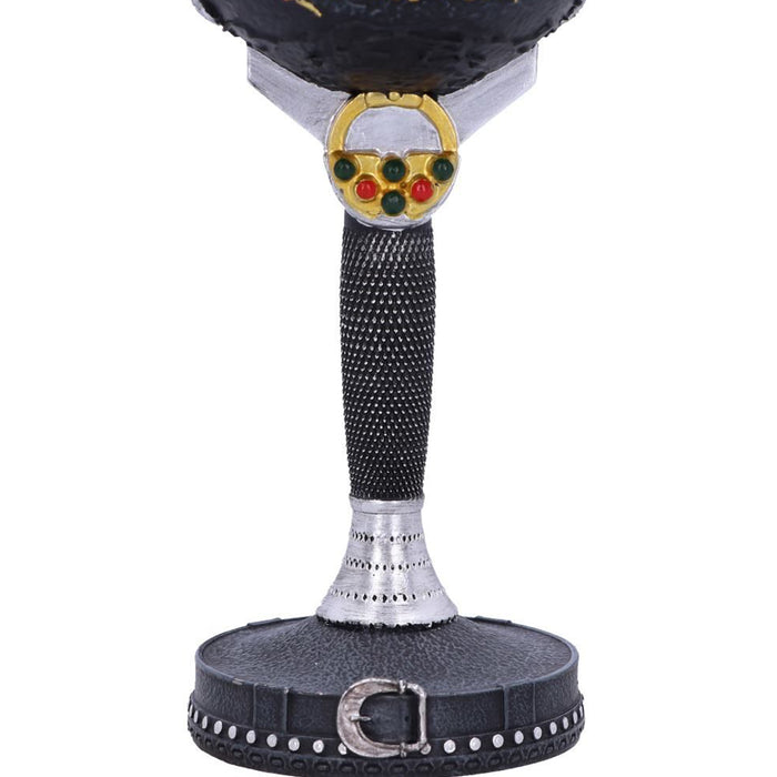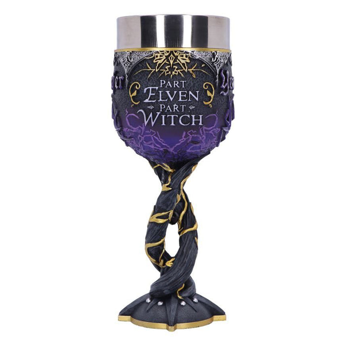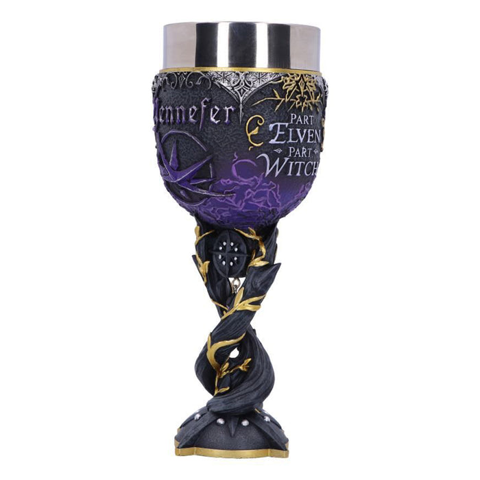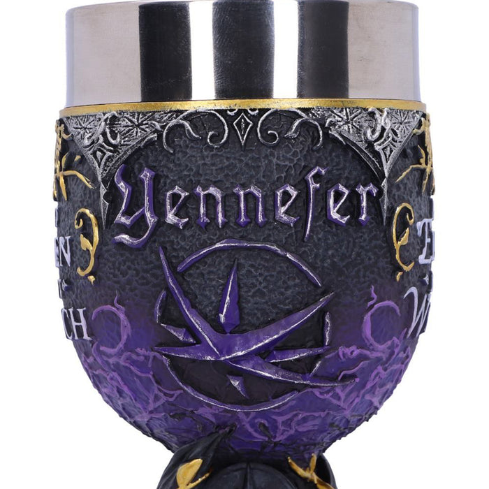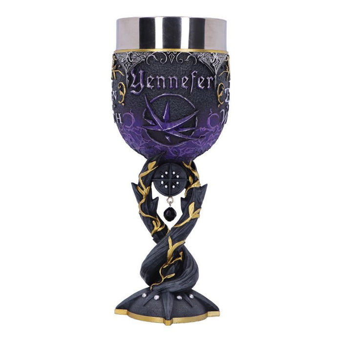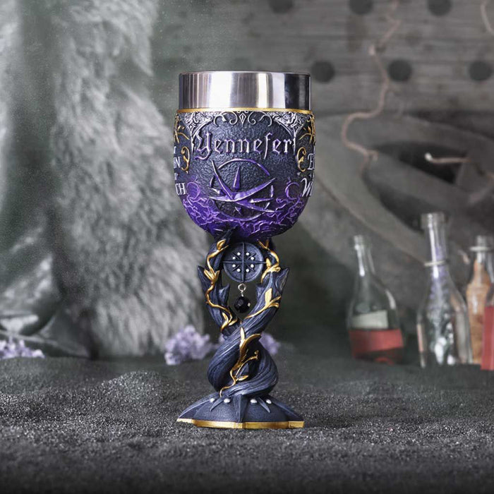 • Der Yennefer gewidmete Weinkelch zeigt im Zentrum den Obsidianstern, den sie zu jeder Zeit als Halskette trägt. Dieser findet sich ebenfalls als Symbol auf dem Kelch, auf dessen gegenüberliegender Seite die Worte „Part Elven Part Witch“ prangen.