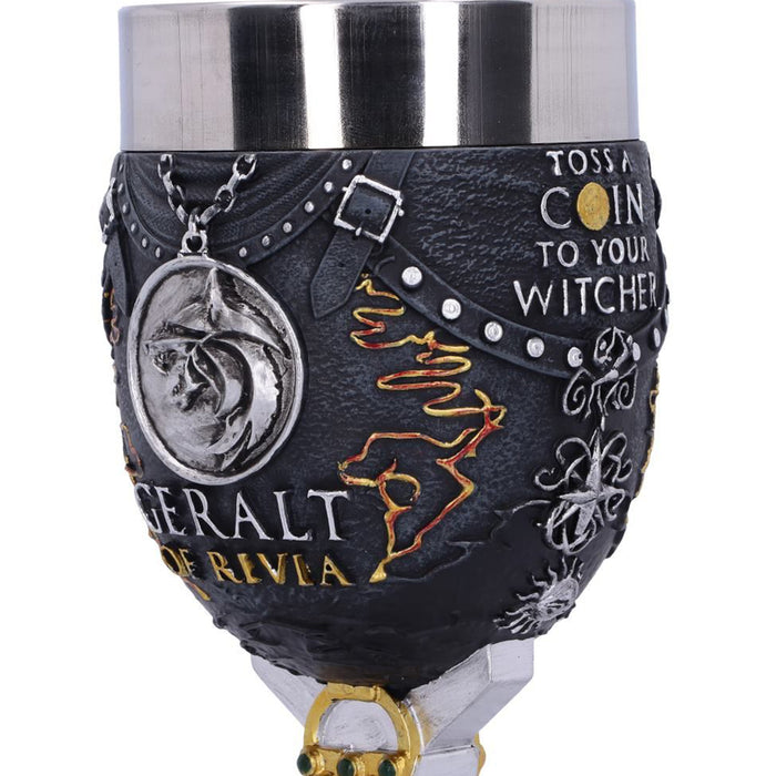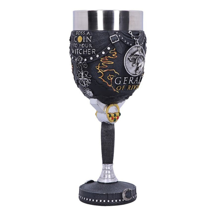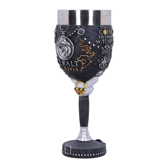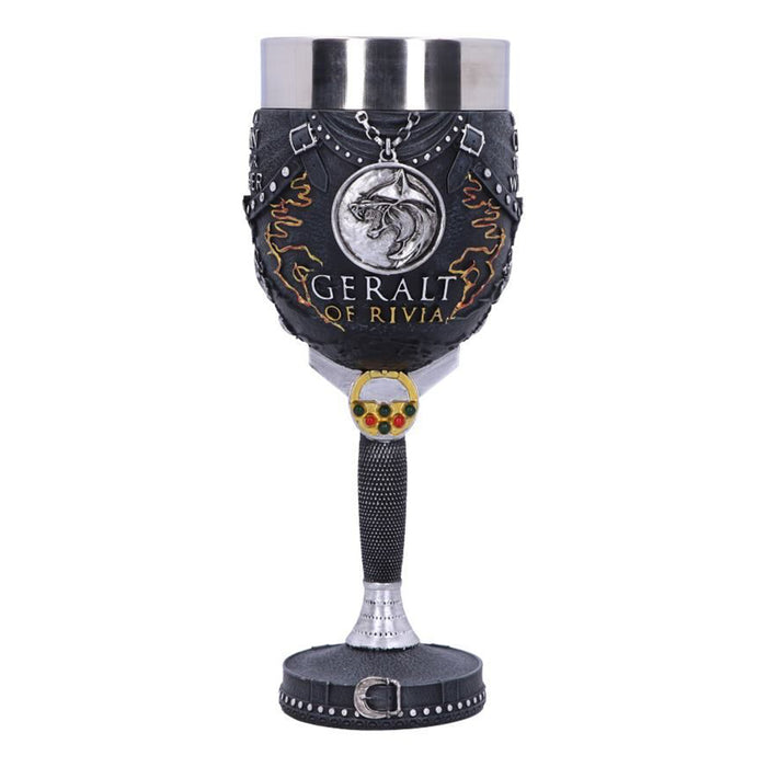 • Geralt ist ein sehr genügsamer Mutant und schlägt einen Weinkelch mit Beauclairer Weißwein nicht aus. Das Gefäß ist im Stil seiner schwarzen Lederrüstung gestaltet, mit einem seiner Schwerter als Stiel. Außerdem zeigt er natürlich das Wolfsmedaillon und den Schriftzug „Toss A Coin To Your Witcher“.