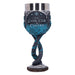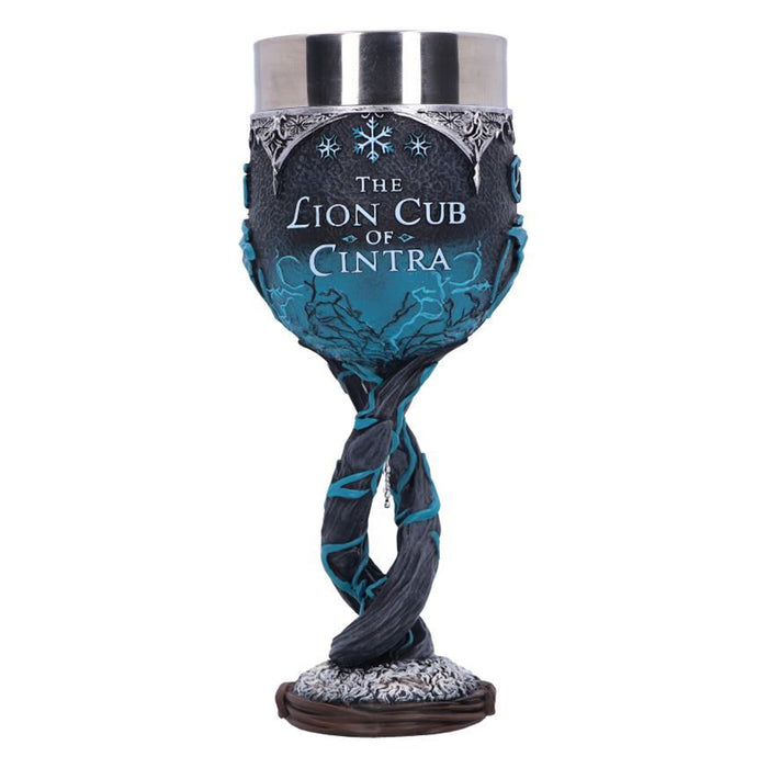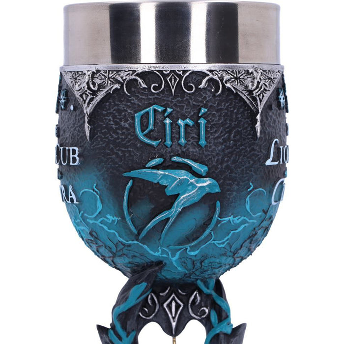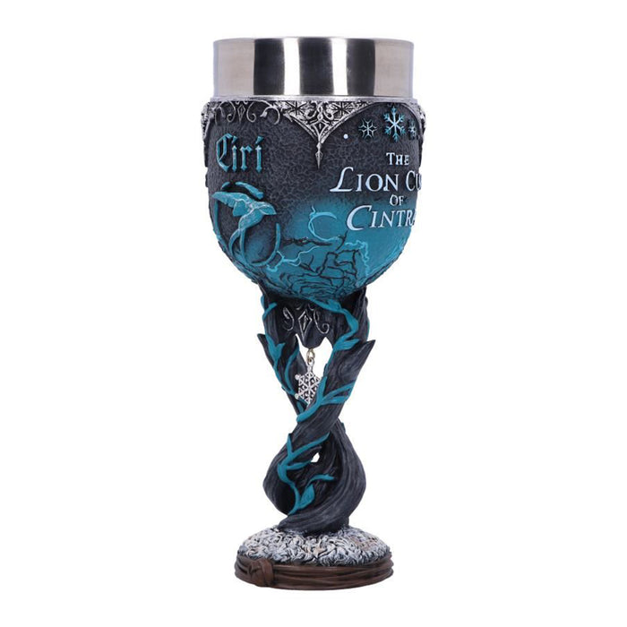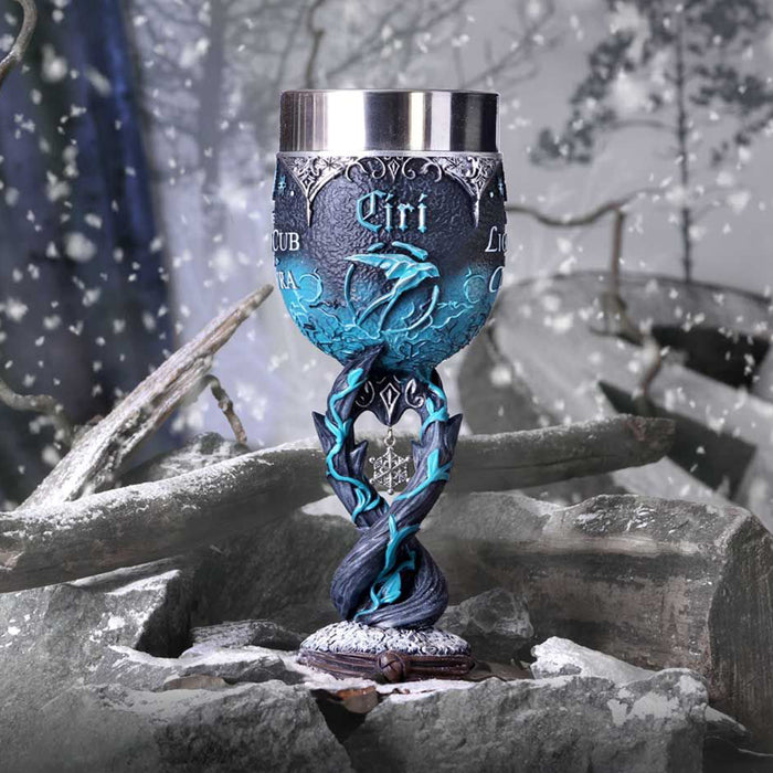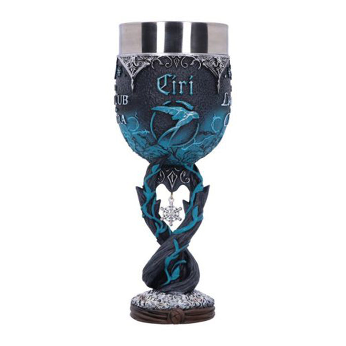 • Der blau verzierte Weinkelch, der Geralts Ziehtochter Ciri gewidmet ist, zeigt neben dem Symbol der Schwalbe den Schriftzug „The Lion Cub of Cintra“. Dieser erinnert an ihre Herkunft als Tochter von Emhyr var Emreis, auch wenn sie diese selbst oft nicht wahrhaben will. Im verschlungenen Stiel des Kelchs baumelt eine einsame Schneeflocke in Anlehnung an die Wilde Jagd, die Ciri auf den Fersen ist…