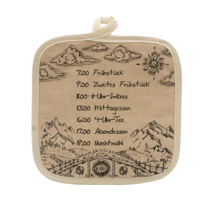 Oft genug werden die Halblinge belächelt – für ihre Größe, ihre behaarten Füße oder ihre Essgewohnheiten. Aber seien wir mal ehrlich, eigentlich beneiden wir sie um ihre sieben Mahlzeiten am Tag. So viel leckeres Essen scheint ja auch sehr zufrieden zu machen, wenn man sich die meisten Bewohner des Auenlandes anguckt. Und es spricht doch nichts dagegen, hin und wieder diese Essgewohnheiten nachzuahmen. Die zwei Topflappen zeigen dir den genauen Auenland Speiseplan, damit du keine Mahlzeit verpasst (es wäre ein Skandal, das zweite Frühstück auszulassen!) und bewahren sowohl deine Hände, als auch deinen Tisch vor heißen Töpfen oder Pfannen.